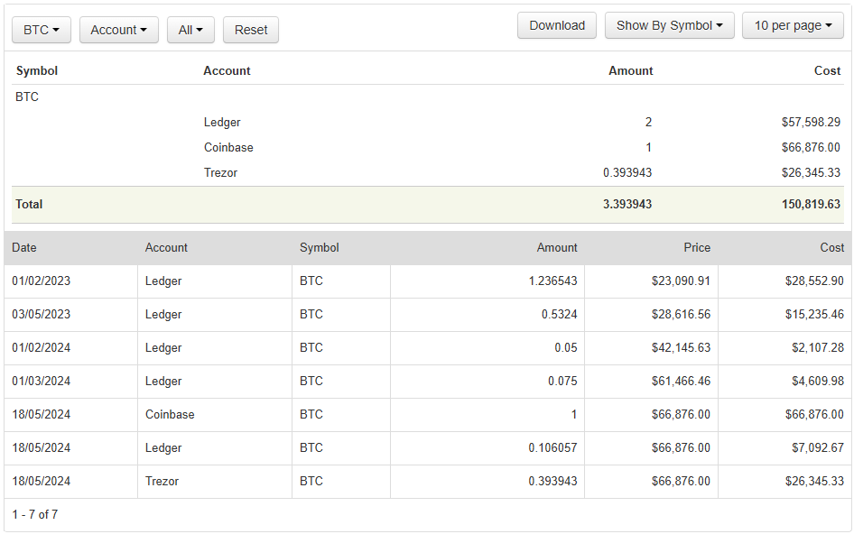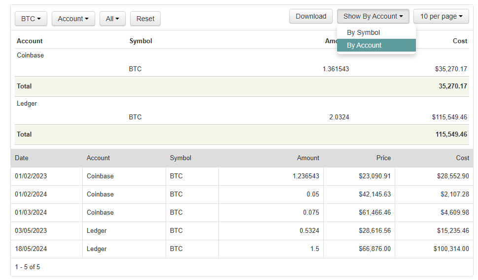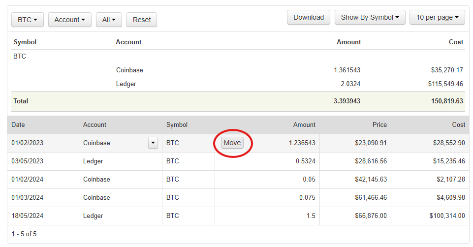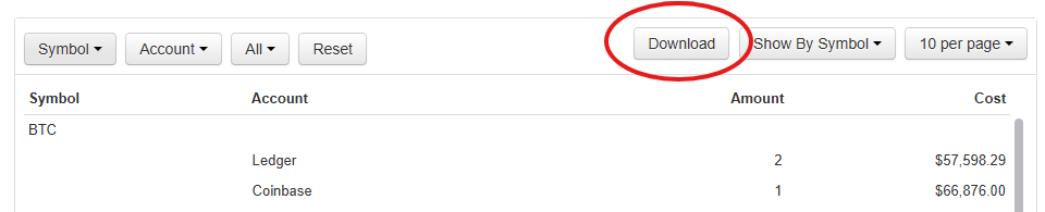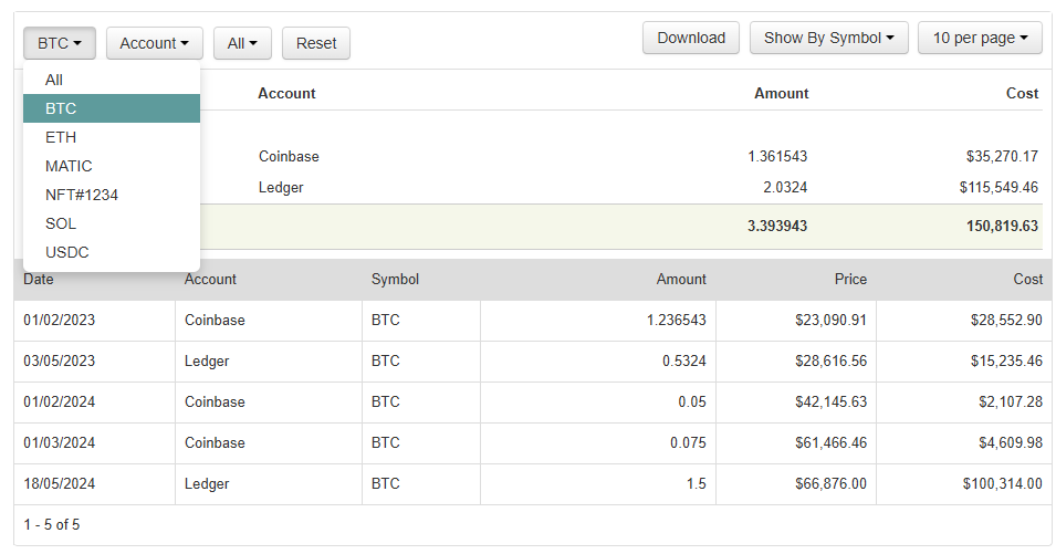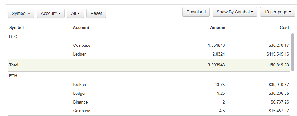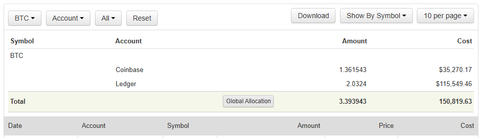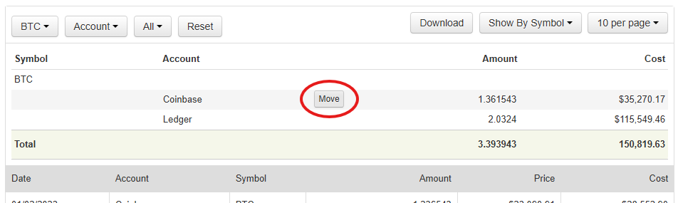 You can click the Symbol or Account buttons to filter for specific crypto or in certain wallets.