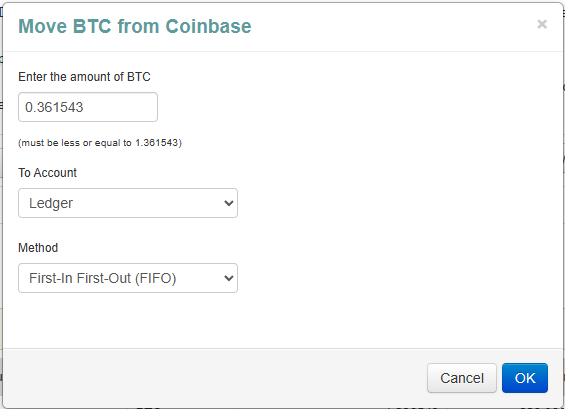 You can choose a lower amount to only move some of the balance. For example, say we actually had only 1 BTC in the Coinbase account and need to move the remainder to Ledger. We can change the value to be just 0.361543. This will cause any lots to be split and only move that amount to the Ledger wallet.