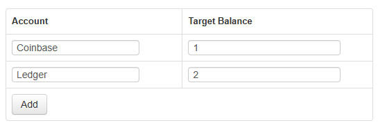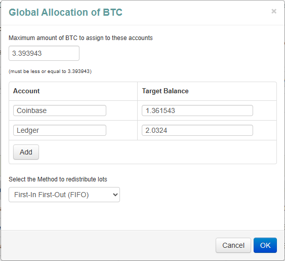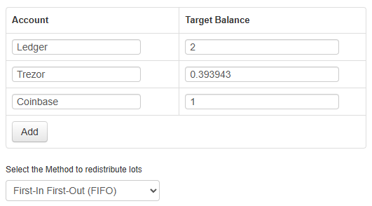 Now you can enter the balances you actually have in your wallets, clicking the Add button if you have more wallet names, until they add up to your total amount. You can also choose how the lots are assigned using the method choice. The system will do that in the order the wallets are listed.