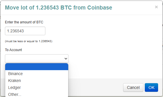 This will let you assign this lot to a new wallet, or select "Other..." and enter a new name. You can also move only a partial amount, for example, entering "1" instead of "1.236543". This will split the lot into two parts and move just 1 to the other wallet.