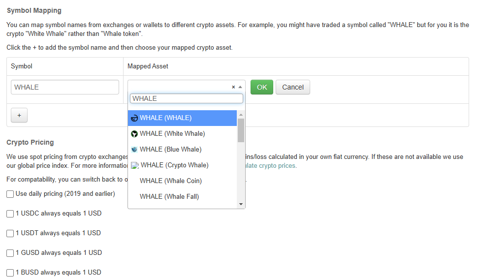 We try and maintain unique names for crypto symbols. If you visit out crypto pricing page at https://bitcoin.tax/prices, you'll see the list of current prices for the major crypto symbols we track. If we search for WHALE, we'll see a number of crypto, include Whale, White Whale, Blue Whale and Crypto Whale, all using the same symbol.