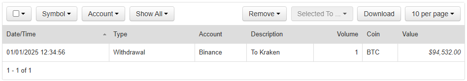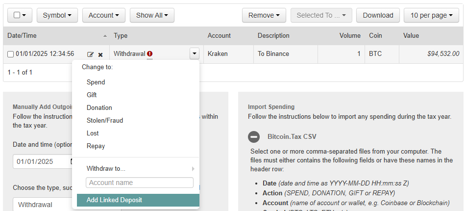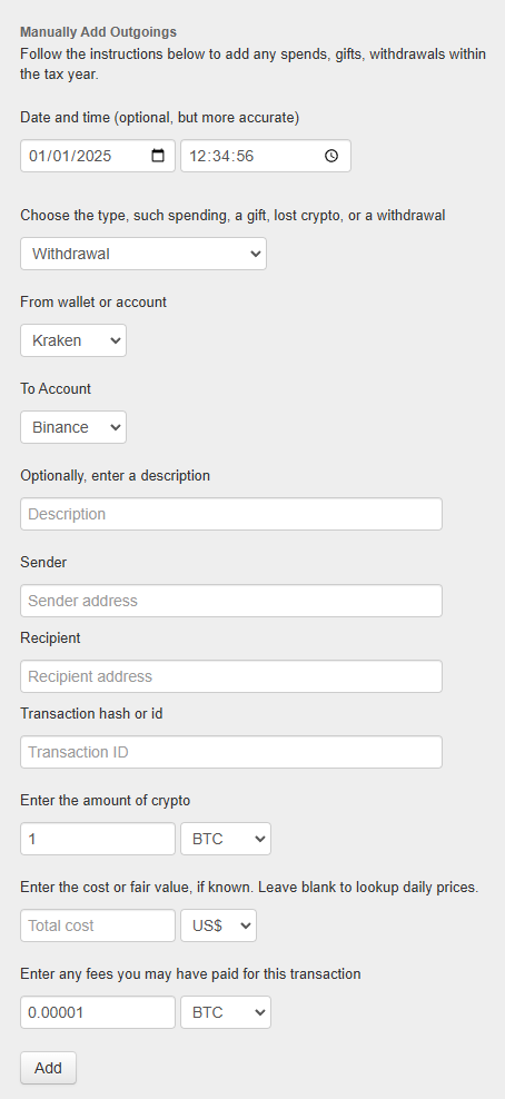 Go to the Spending tab, and in the form on the left, add your entry. For example, here we are adding a Withdrawal from Kraken to Binance of 1 BTC plus a 0.00001 fee.