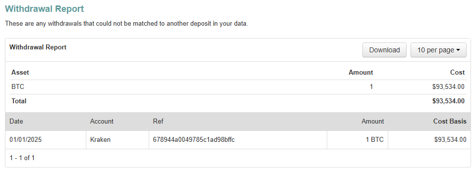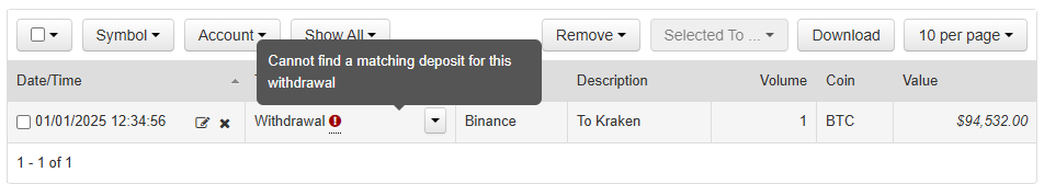 For example, say I import my Kraken CSV that has a Withdrawal of 1 BTC, it will appear with an exclamation.