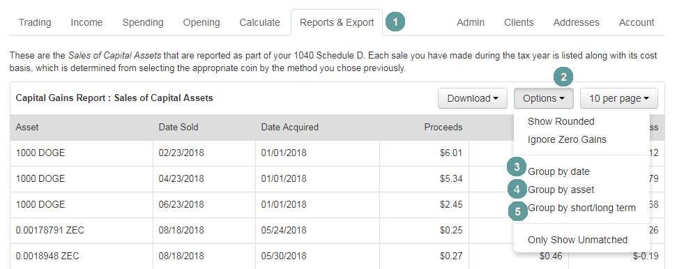 3- Choose either Group by date (3), Group by asset (4), or Group by short/long term (5)